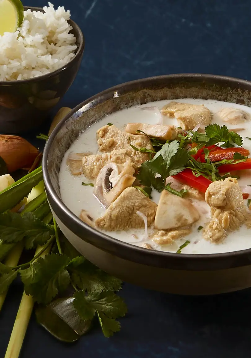 Le Tom Kha Kai est une soupe thaïlandaise exquise, mêlant du poulet tendre mariné à l’ail, des champignons parfumés et des herbes fraîches, le tout mijoté dans un bouillon onctueux de lait de coco et relevé par des épices exotiques. Les notes citronnées de la citronnelle fraîche et le croquant du poivron rouge créent un équilibre parfait, offrant une expérience gustative inoubliable à chaque bouchée.